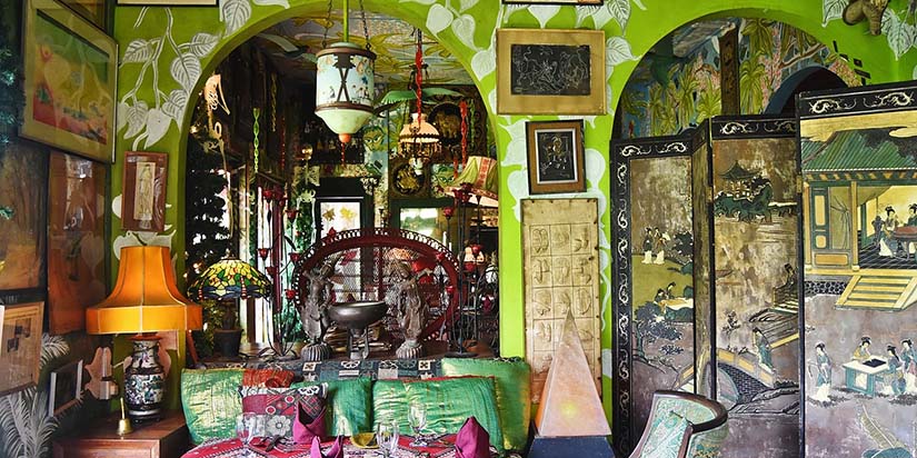 The entrance lobby is covered in decadent plant paintings going up the walls. Head into the main living area wherein you’ll see candelabras covered in decades’ worth of wax (Addams Family vibes?), all maintaining the bohemian jungle theme.
