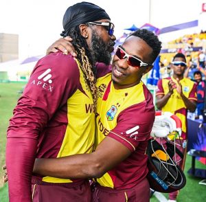 Gayle (on left) and Bravo bid farewell yesterday (6) at the T20 World Cup[/caption]